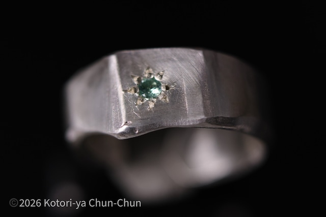 今回はペルヴィアンオパール、オレゴンサンストーンと並び、2025年に小鳥屋が探し回った石のひとつパイライトインエメラルド!( ◜ω◝ ) この緑と銀の混ざった宝石をSNSで見かけて小鳥屋はなんとしても欲しくなり、世界中を探し回ってしまいました。 入手難度はなかなか高めだった。。。 パイライトというのは黄鉄鉱という鉱物でこれ自体は日本でも採れる鉱物なのですが、時々他の石と混ざっていることがあります。 作品の写真をよく見ると銀色の粒のような、ラメのようなものが見えると思います。これがパイライト。これが入っているエメラルドがまぁ珍しい。。。 前にギャラクシーアメシストという名で出したアメシストを覚えていらっしゃる方もいるかもしれません。銀色のインクルージョンが入っていましたね。あれは今思えばスーパーセブンにパイライトが混ざっていたんですね`‐ω‐´) あれ、スーパーセブンを売ってくれるセラーのハビブに確認したら「レアすぎて狙っては手に入らない」って言ってました。 ギャラクシー持っている方はラッキーでしたね。超レアだそうです`‐ω‐´) こういう石たちは市場に出回ることが少なすぎて相場がわからないから仕入れ値ベースで値段つけるので、大安売りしてしまう傾向があります(´ω`;) このパイライトインエメラルドちゃんは相場は知らないけど、この透明度なのでそこそこお値段張りました(´ω`;) なんか透明度全く無い濁った緑のエメラルドなら探せばあるにはあるんですけど、こういうクリアな感じの探すのは相当大変なのよ…。 ということで今回は小鳥屋が最近よく買うセラーの1人、パキスタン人のタイアのパイライトインエメラルド。 パキスタンの市場を走り回ってもらい、3つか4つはNG出しましたね。 ロットの中でも使えない石もいくつかあって、パイライトインエメラルドって本当に難しいんだなと痛感しました(´ω`;) ちなみに銀色のキラキラといえばアヴェンチュレッセンス。サンストーンなんかに含まれてるヤツですね。 あれにもパイライトって含まれるのだろうかと思って調べてみましたが、アヴェンチュレッセンスの場合にはヘマタイトやコッパーなどが多いようです。ただし、稀にパイライトが含まれていることもあるそう`‐ω‐´) パイライトは金属光沢と高い反射性があるのでアベンチュレッセンス(キラキラ)が出るみたいですね。 ということは量にもよるんだろうけど微細なパイライトの場合はエメラルドサンストーンとも言えるのかしら`‐ω‐´) 余談も余談ですが、パイライトを含む可能性がある宝石としてはエメラルドの他にクォーツ、ラピスラズリ、サファイアなんかがあるそうです。クォーツってことはアメシストやシトリン、ローズクォーツやカルセドニーあたりもパイライトは含んでもおかしくないみたいですね。 話を戻しますが、この子は目立つ大きめのパイライトが真ん中近くにポツッとあるのがたまりません(∩∀`*) エメラルドの上にまるで銀色の雪が降り積もっているように見えるので、銘は【銀翠(ぎんすい)】とします。 この深い緑の中に煌めくパイライトを是非楽しんでください(∩∀`*) 石との出会いは一期一会。 もし呼ばれていたらこの機会をお見逃しなく! 石: 特注カット パイライトインエメラルド 5mm×4mm サイズ: 8号 (※ 8〜10号までは調整可能ですので、ご希望の方は購入時にお教えください) 地金:シルバー925 仕上げ:サテン仕上げ、燻加工 ※当店の商品はネットショップで代理人による委託販売はしておりません。安くても怪しいサイトでうっかり買われないようお気をつけください(´;ω;`)