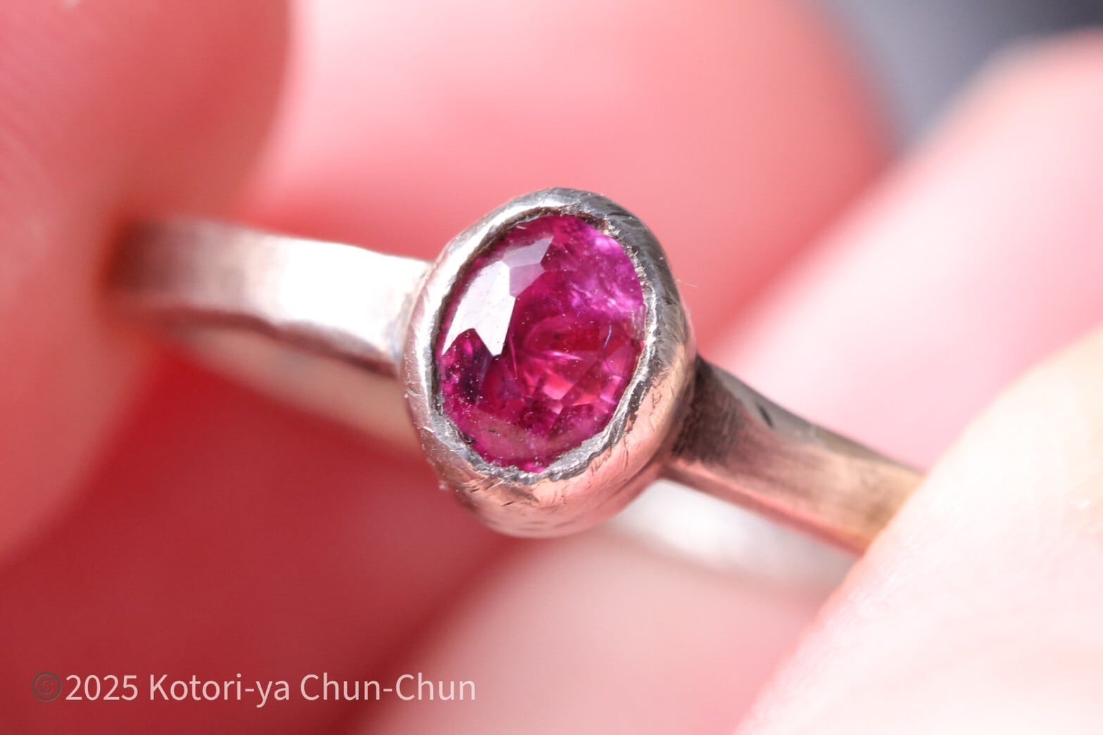 トシッタさんのノーヒートのピンクサファイアと比べるとかなり濃い目。どちらかというとウィンザーサファイアに近いカラーですが、ピンクの中にもよく見ると赤に近い部分とピンクの部分のグラデーションがあって引き込まれる色合いなんですよね。