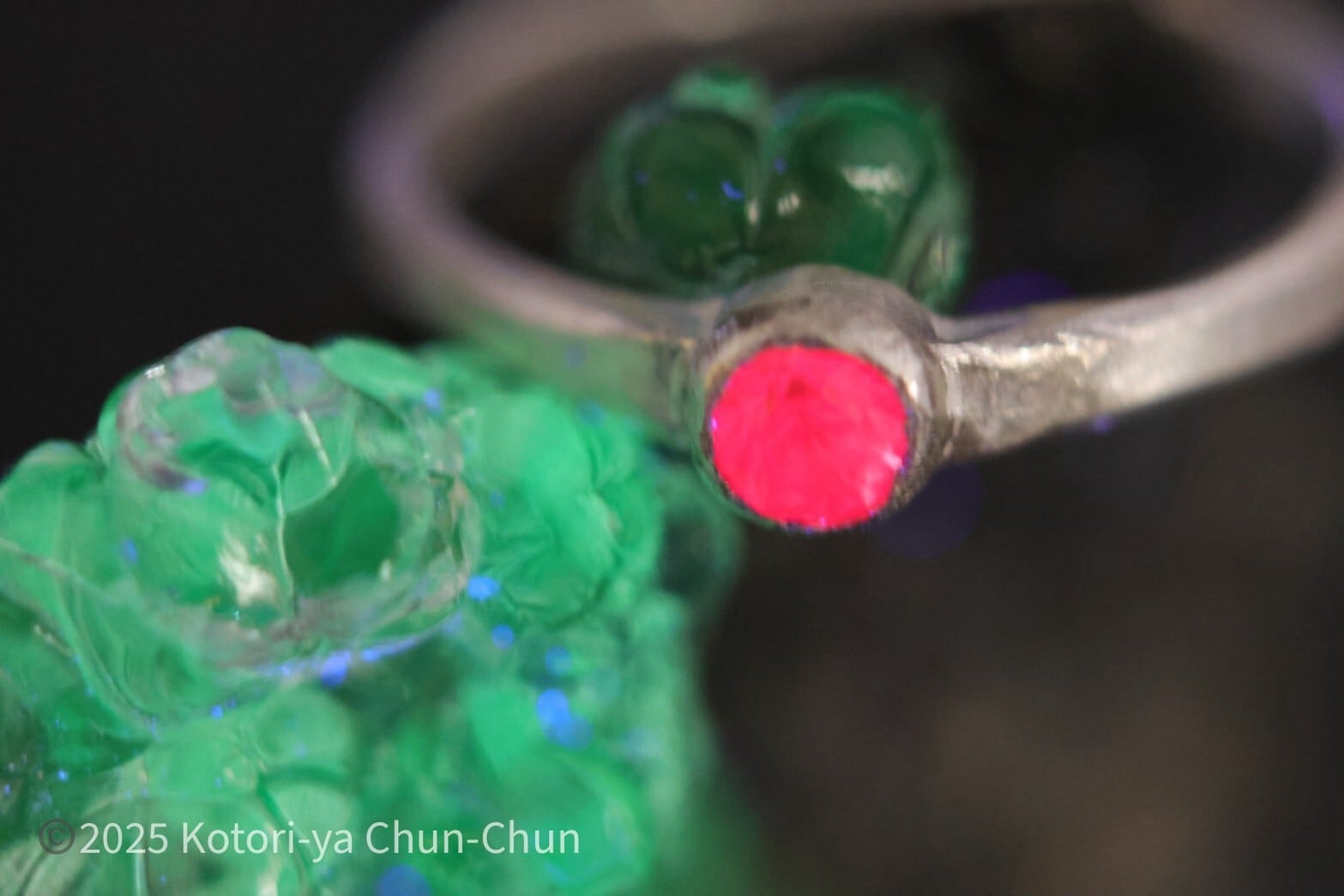 そしてこうした「バラスルビー」の背景を知ってしまうととても愛着が湧いてしまいますよね。この石、産地が珍しいので偶然手にいれたもので、意図的に仕入れたわけではないので兄弟石がないんですよね。