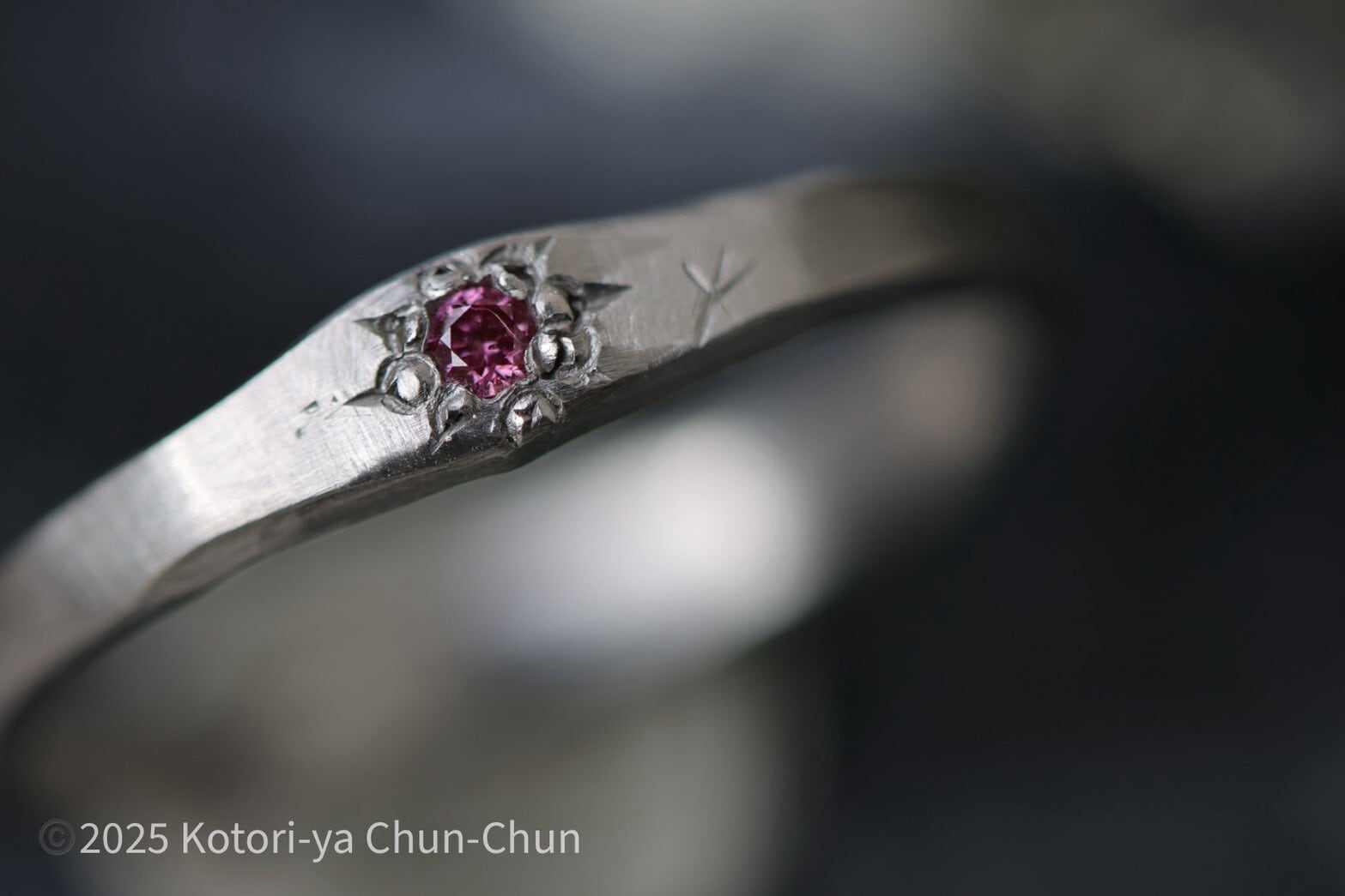 ルースだともっと濃いピンクなんだけどPt900だと地金の色との相互作用で理想形のピンクに収まります。それはそれでちょっと残念な気もするけど…。