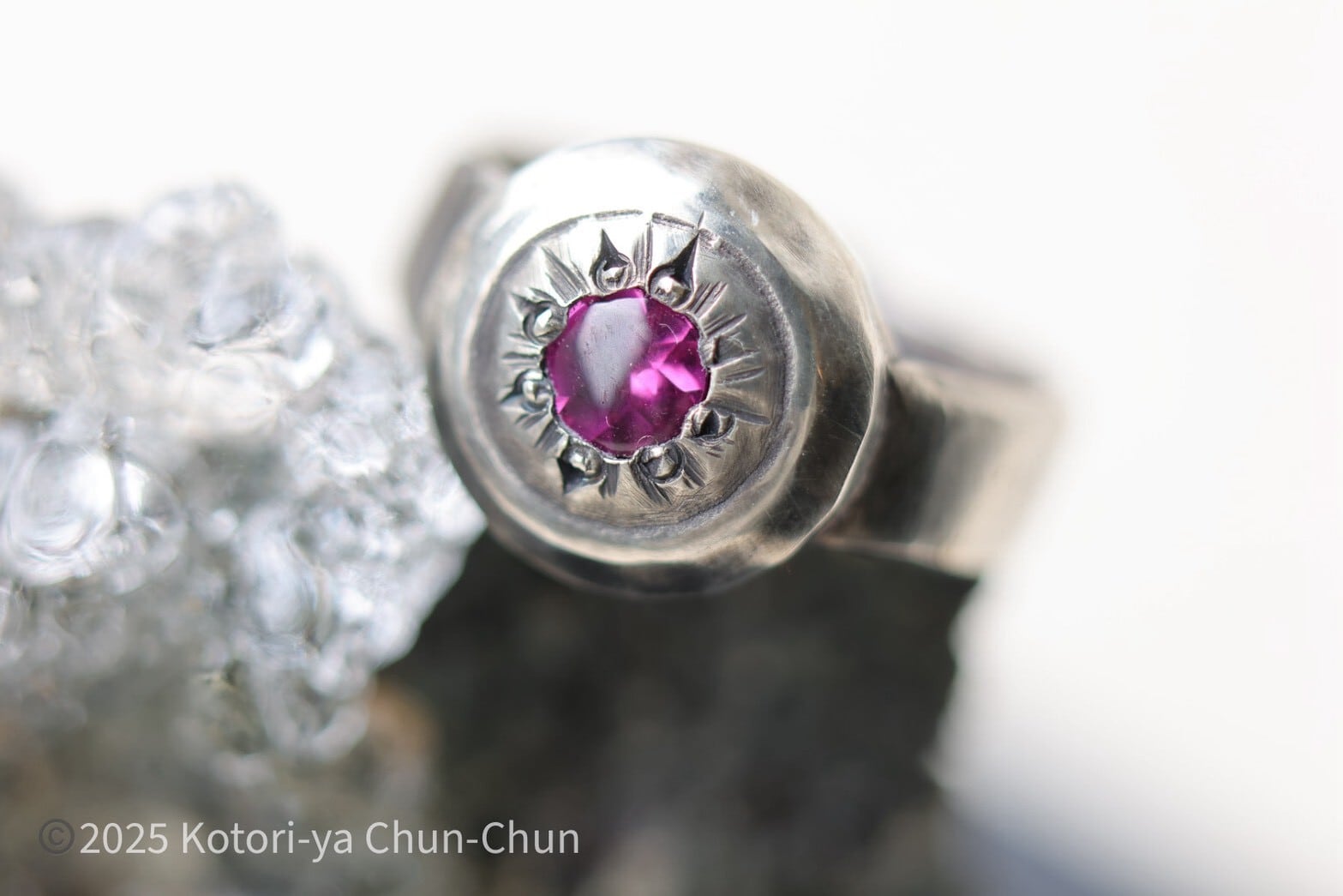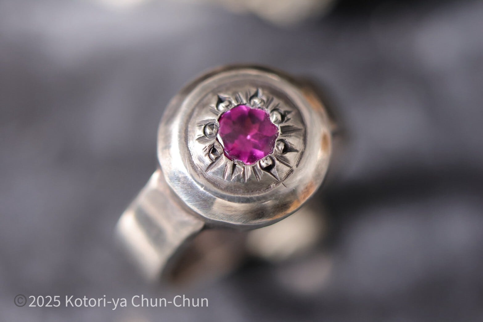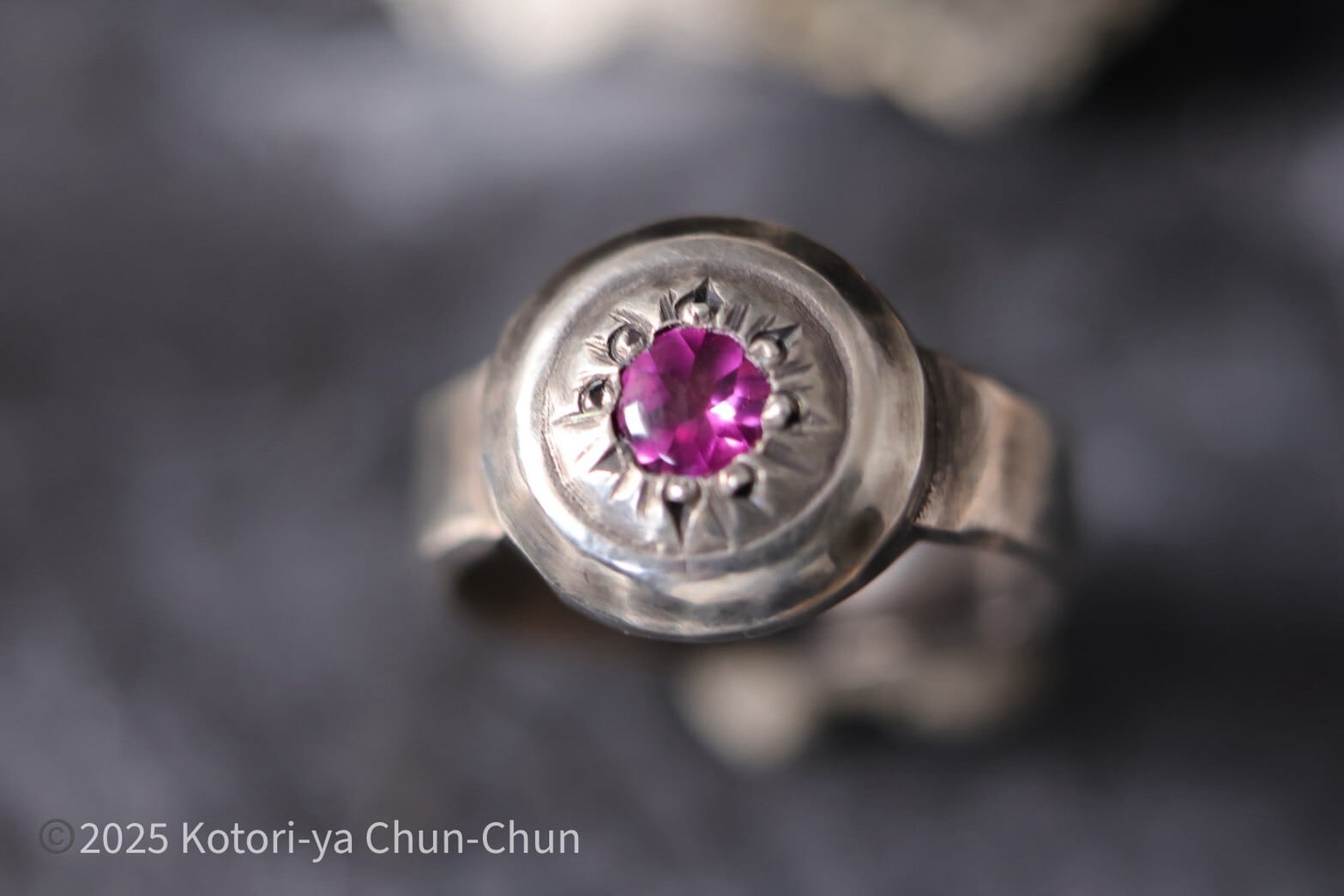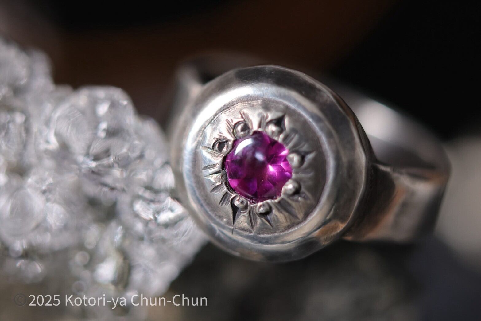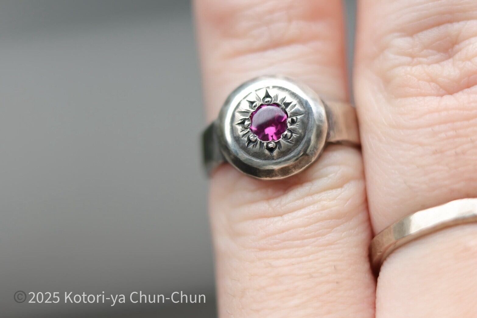 石は2025年春にタイに仕入れに行った際、国際宝飾展で一目惚れしたロードライトガーネット。