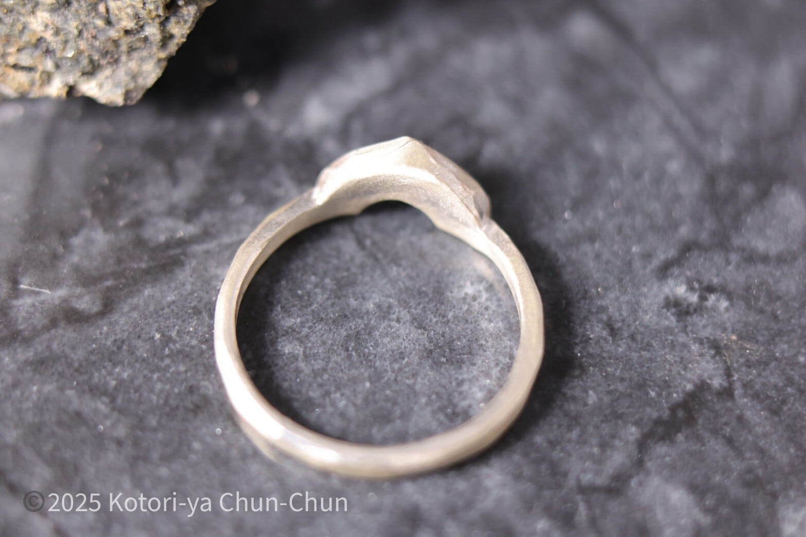 これは単体で着けてもいいですが、基本的に4.5mm以下のラウンドタイプのリングと組み合わせることを想定して作っているリングです。