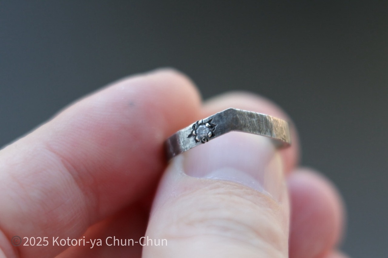 一応、この子は3連リングの一番手前側に来る想定で作ったリングです。それぞれ微妙に重ねた時に違和感が少ないように内側の傾斜を変えているんですよね。