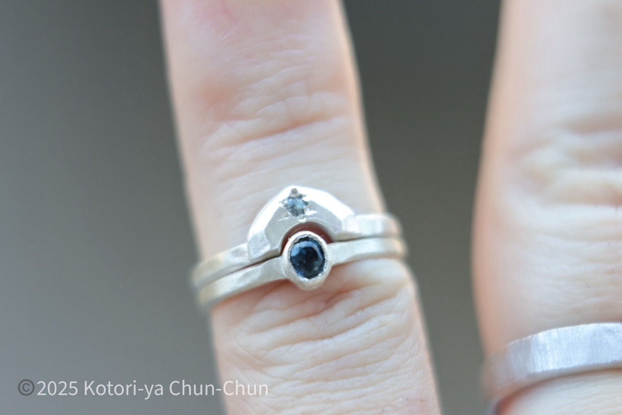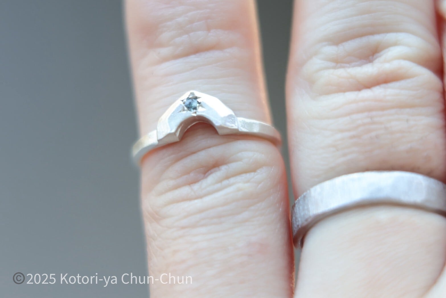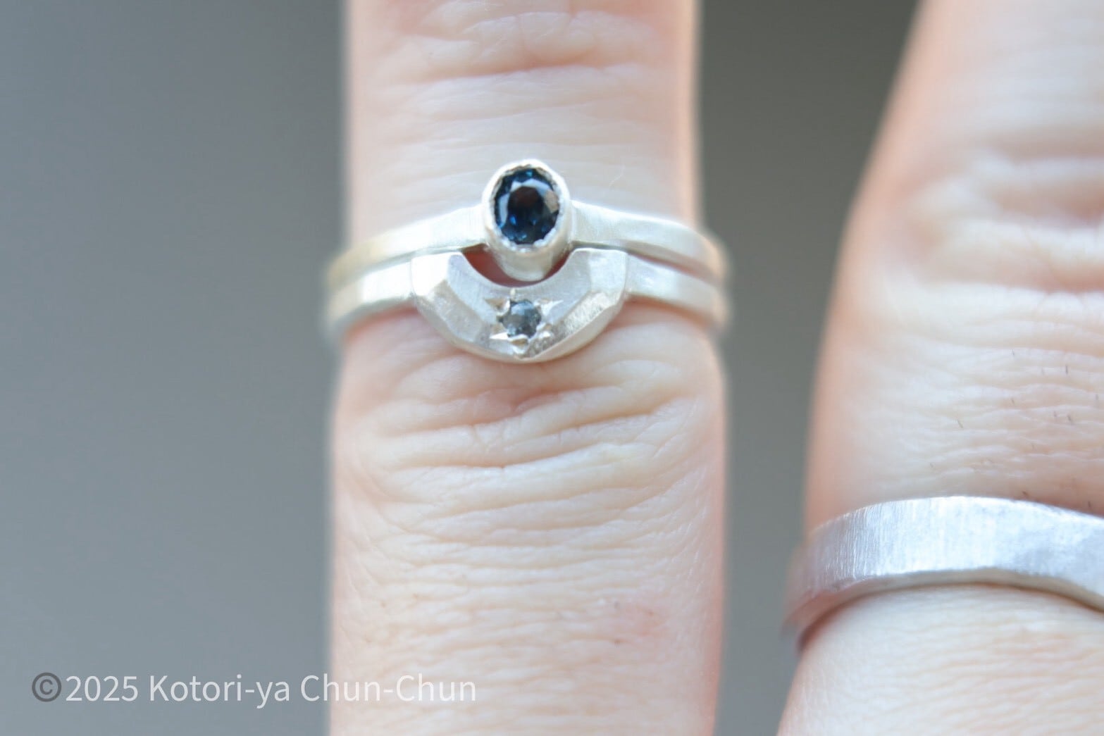 これは単体で着けてもいいですが、基本的に4.5mm以下のラウンドタイプのリングと組み合わせることを想定して作っているリングです。