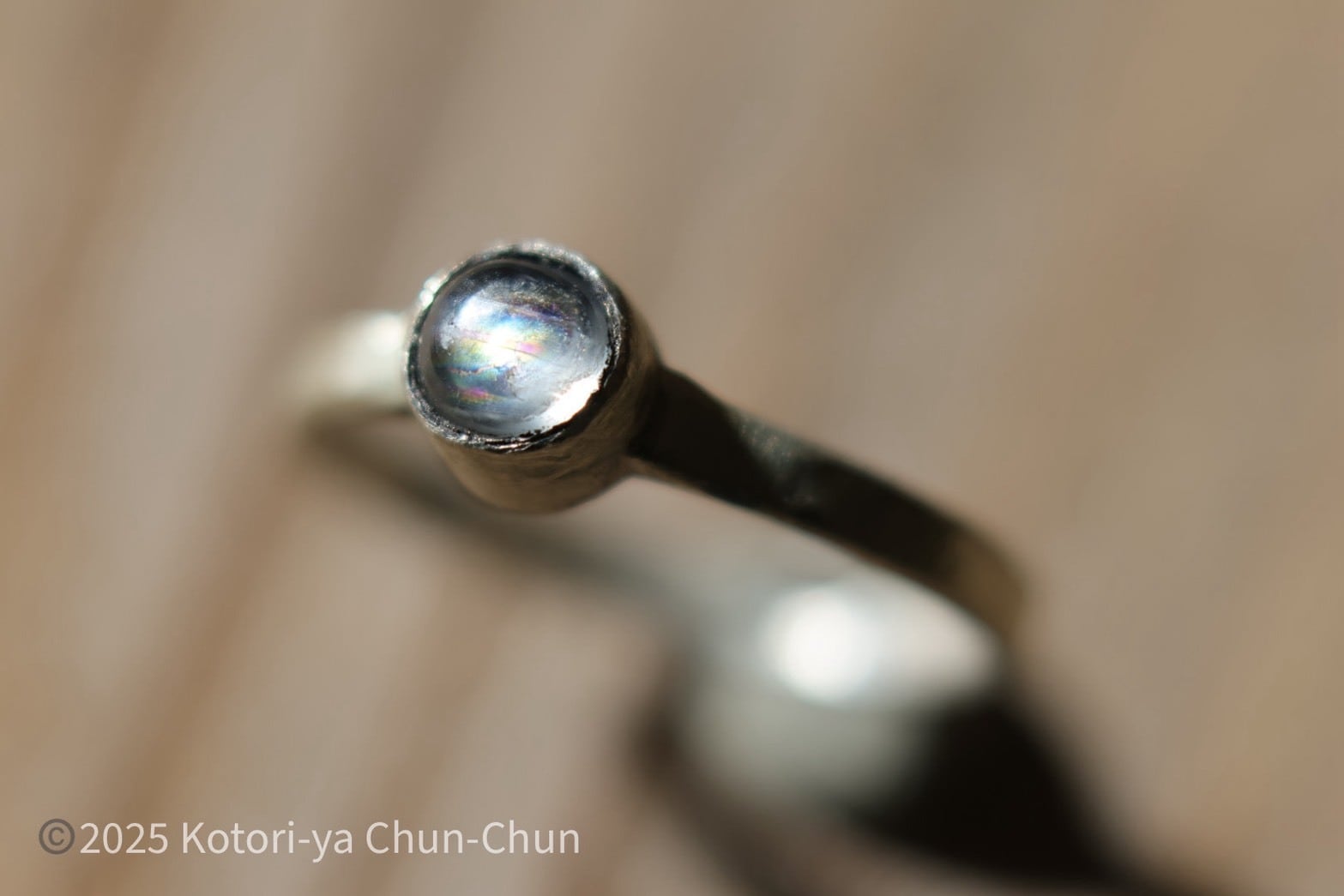 ムーンストーンあるあるですが、普通の台座ではシラーがわかりにくいため、小鳥屋は石座を燻してシラーが出やすくしております。