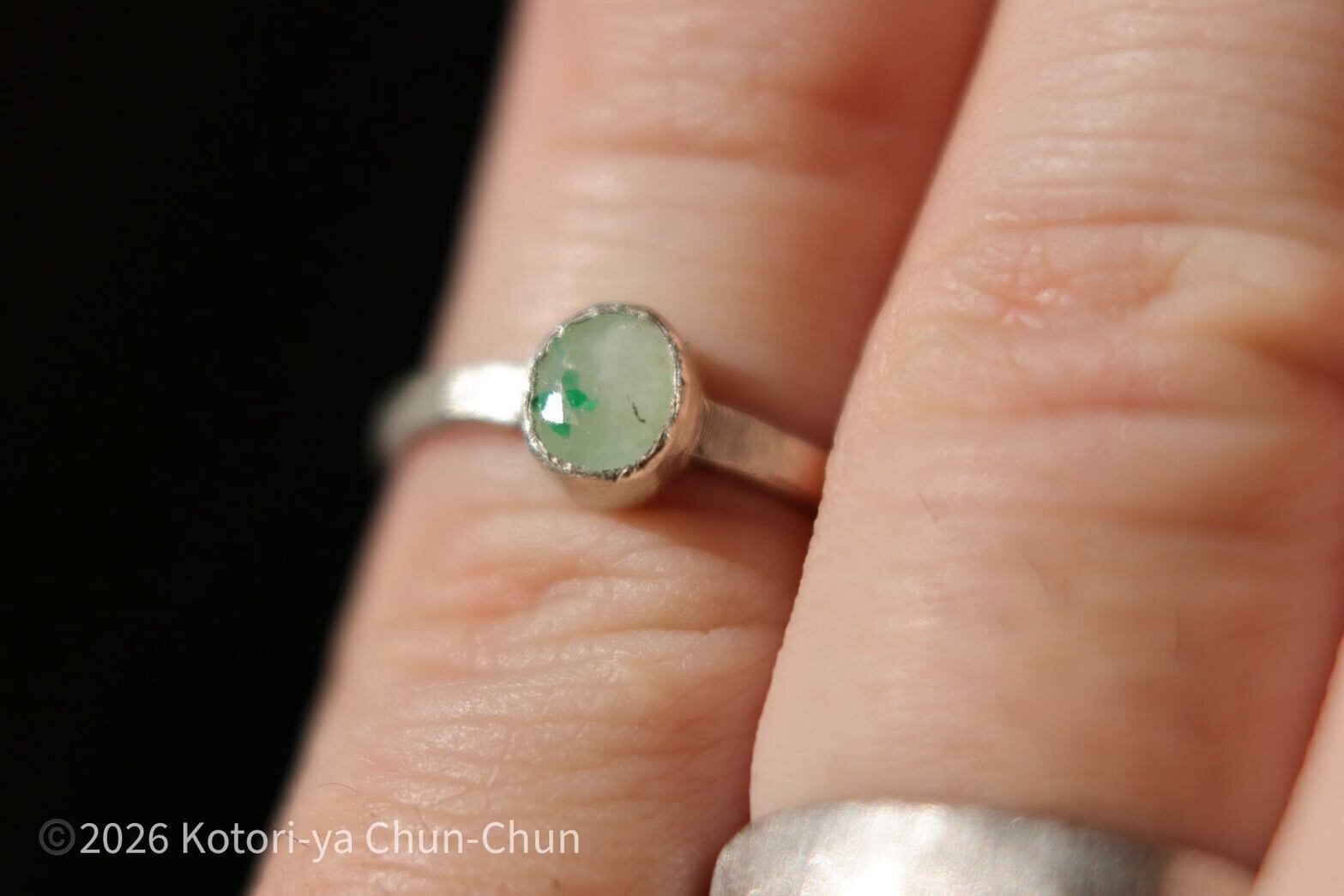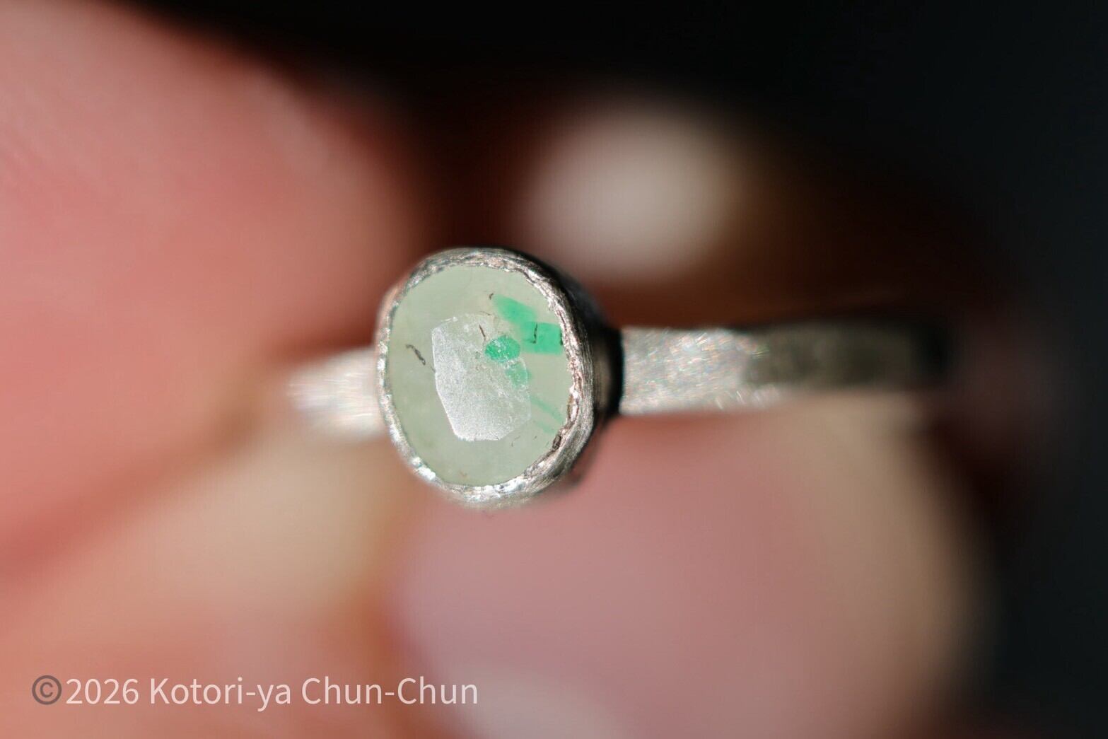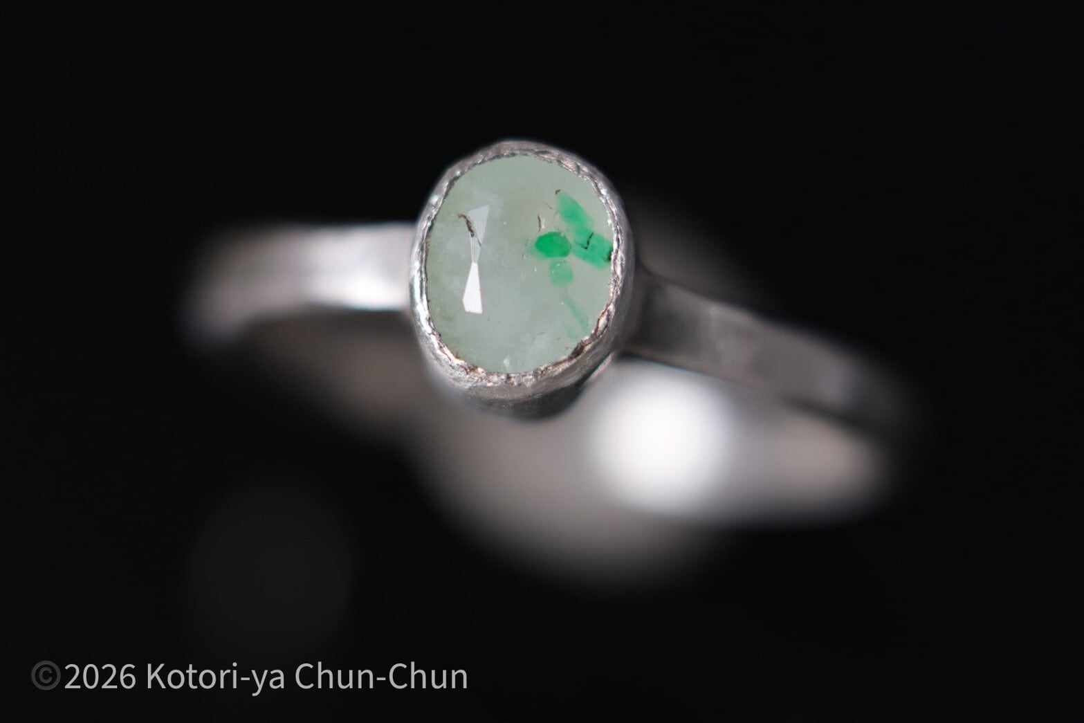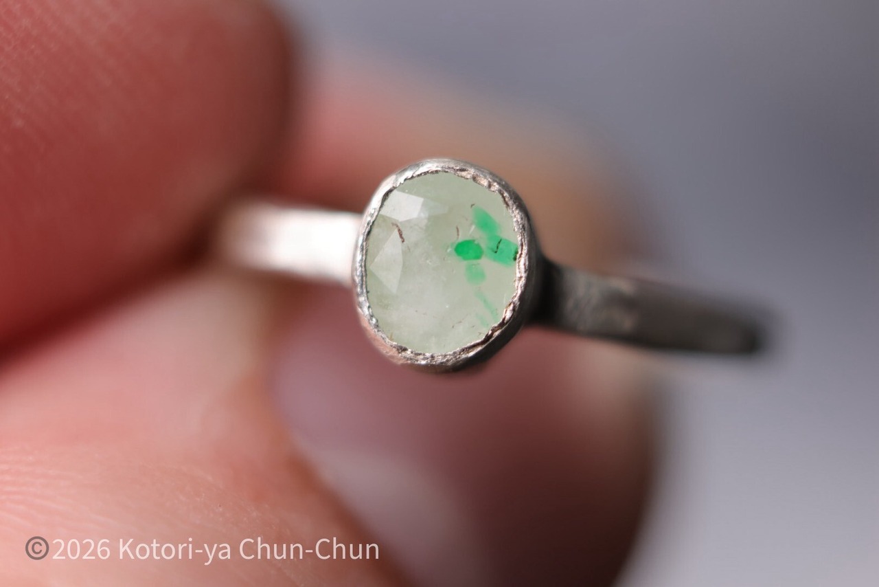 【白い水晶に咲くクローバー】 タイアの特注カット エメラルドインクォーツ・シルバーリング【雪葉】