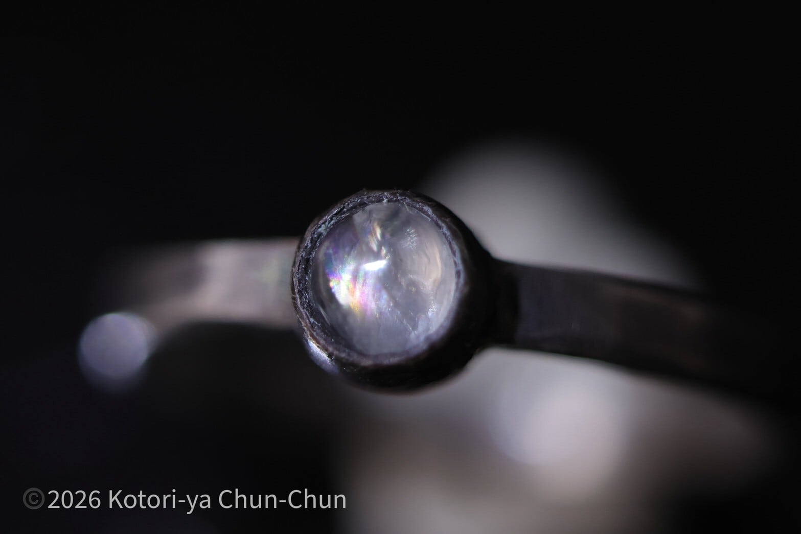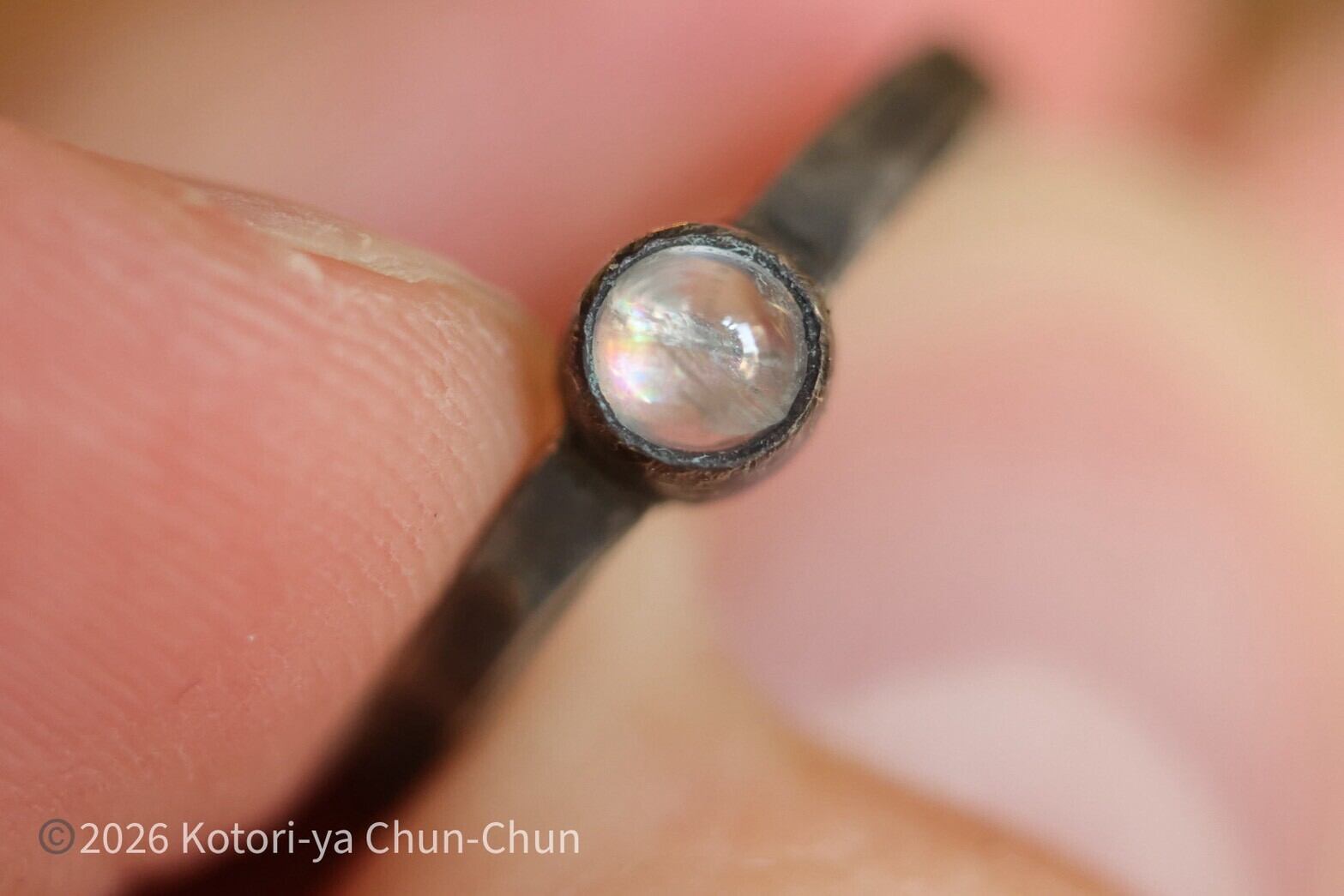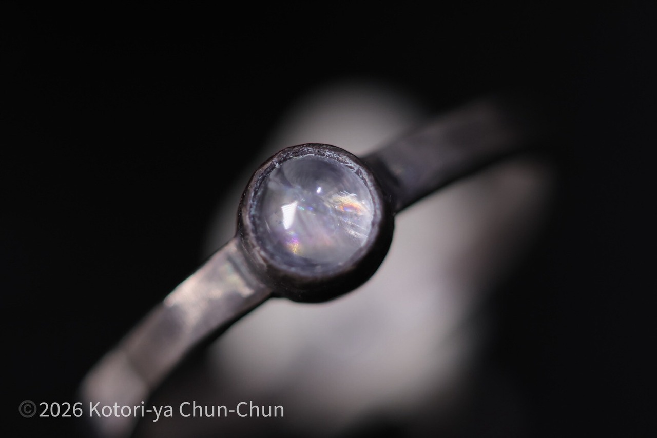 ムーンストーンあるあるですが、普通の台座ではシラーがわかりにくいため、小鳥屋は石座を燻してシラーが出やすくしております。