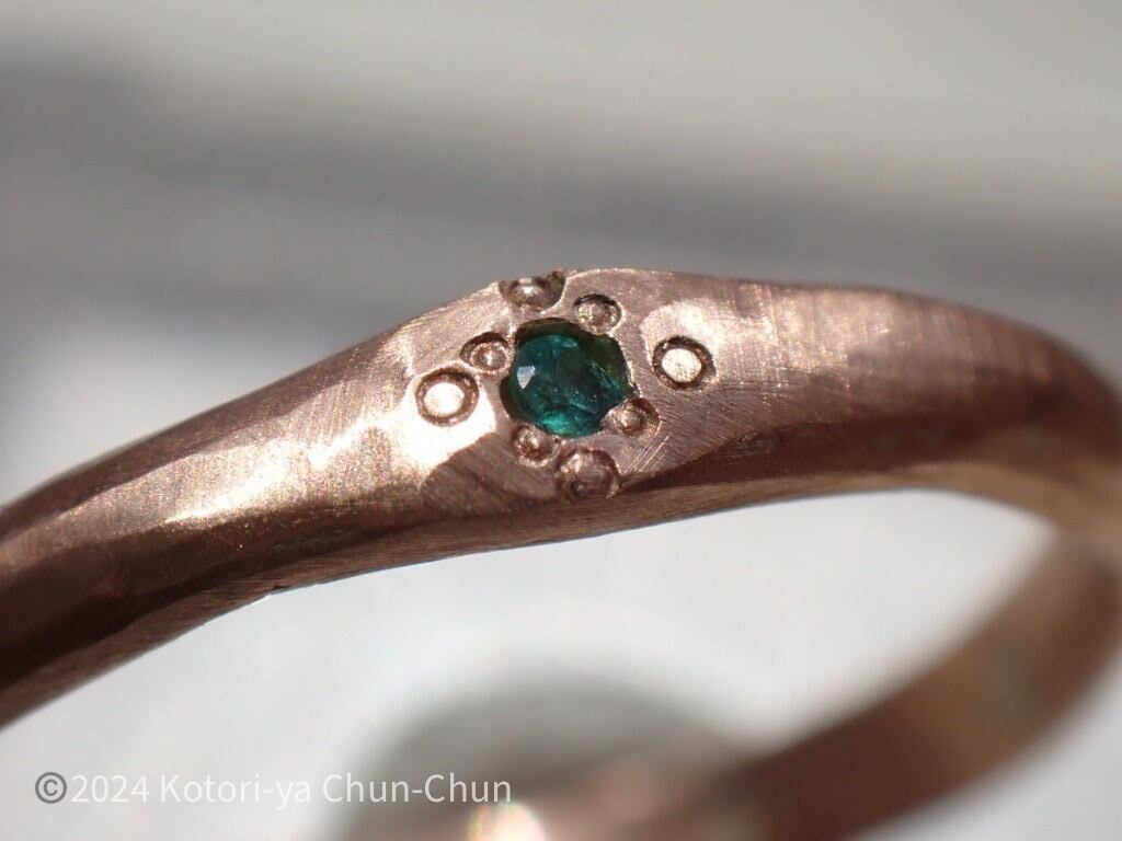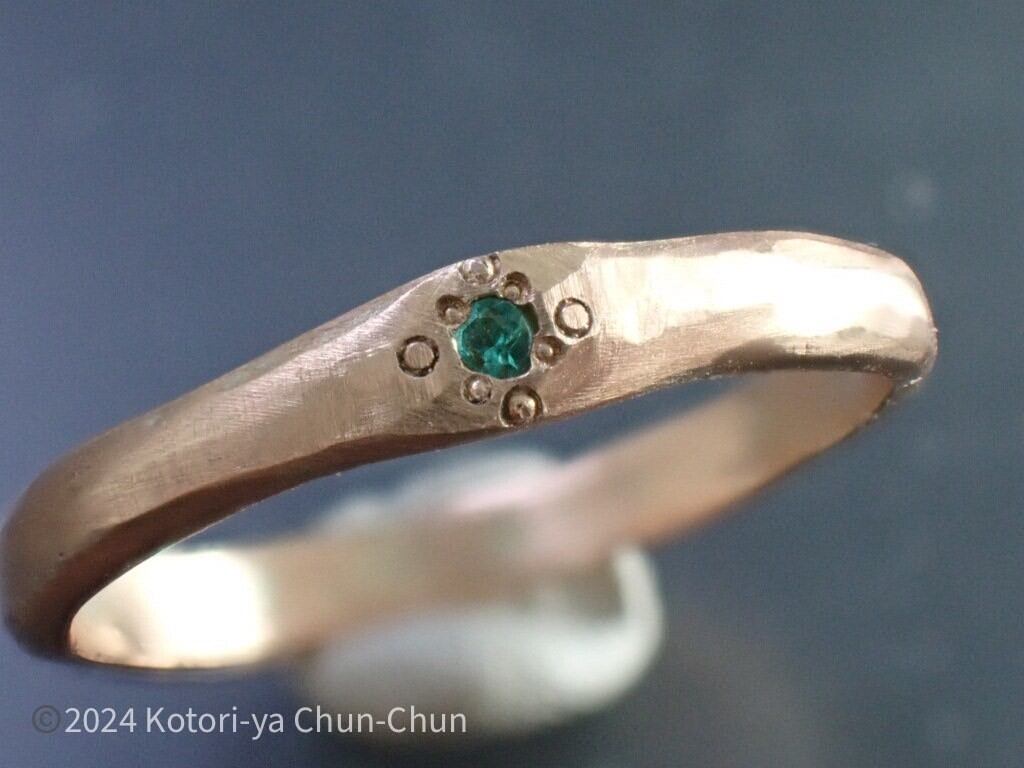 K10のピンクゴールドの地金にネオングリーンブルーの美しい宝石が輝くこの作品、銘は【桜海(おうみ)】とします。