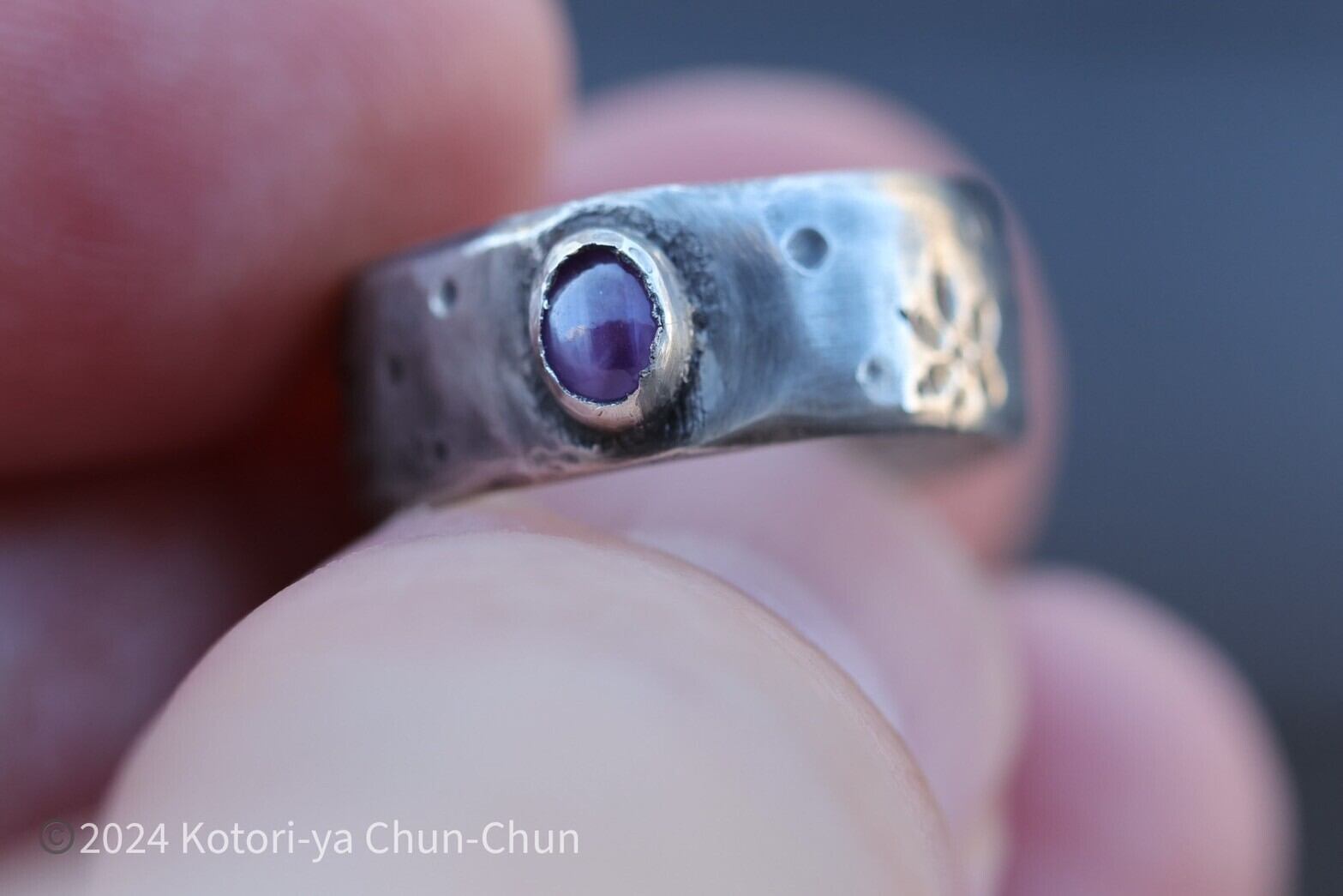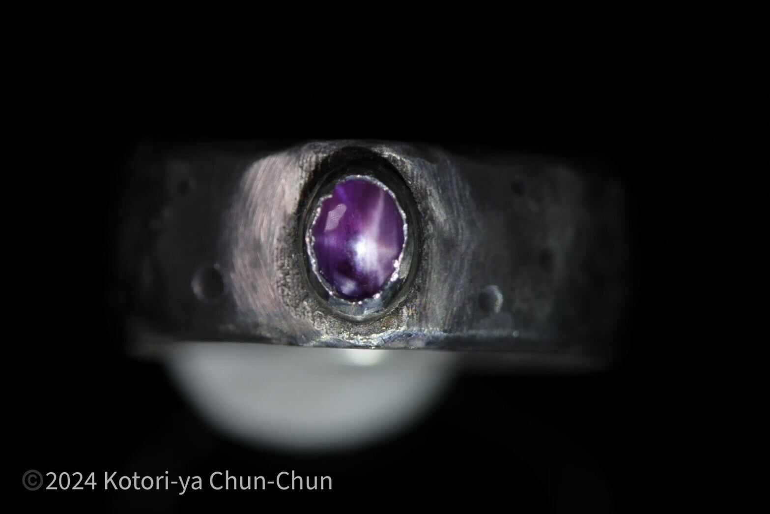 【完全新作】「トシッタさん」のノーヒート・バイカラーパープルスターサファイア・シルバーリング【花吹雪】